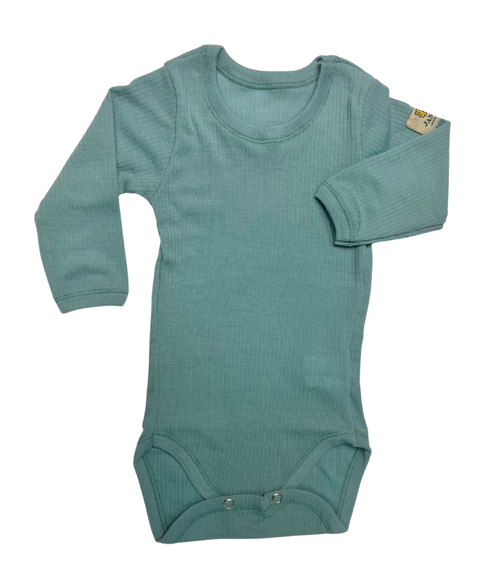 Þægileg samfella úr 100% Merino ull í fínlegu slétt og brugðið prjóni. Eiginleikar ullarinnar sjá til þess að barninu er hlýtt án þess þó að verða þvalt eða sveitt. Ullin getur dregið í sig allt að 30% raka án þess að vera blaut viðkomu, þannig að jafnvel þrátt fyrir að blotna eða svitna verður þeim ekki kalt.